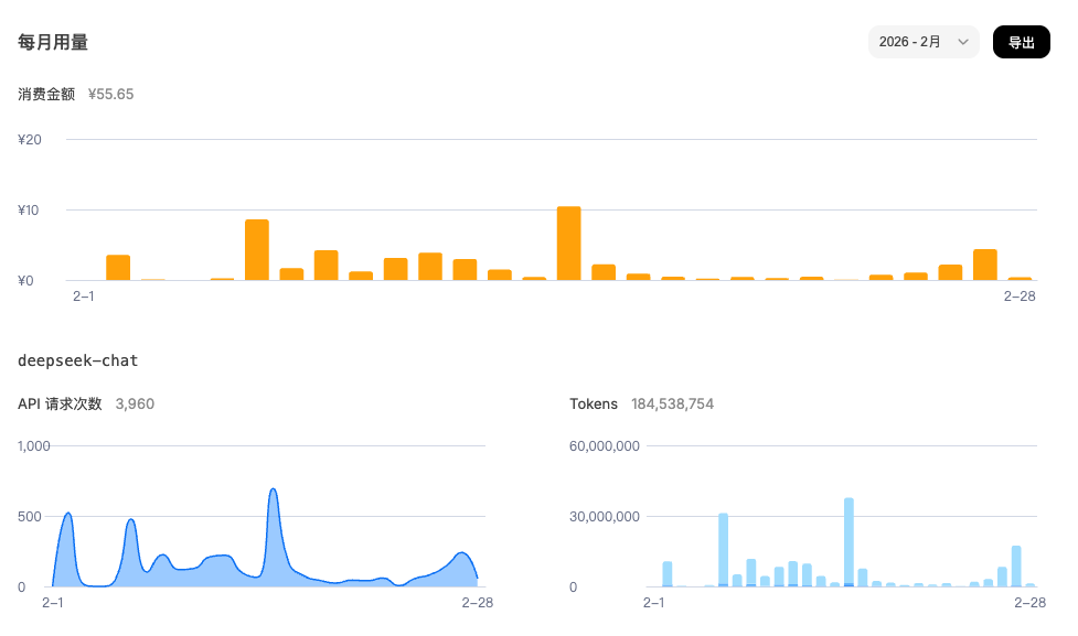 2 月由于使用上了 OpenClaw,DeepSeek 费用直接飙升到 55 块(大约一周 9.9 的咖啡钱)。这里仅供参考,是多是少需要因人而异(我曾在少数派读到过月订阅 5000 的文章)。
