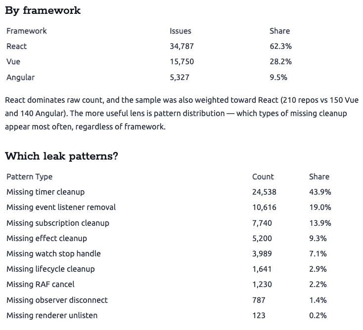 - [2] Frontend Memory Leaks: A 500-Repository Static Analysis and Five-Scenario Benchmark Study: https://stackinsight.dev/blog/memory-leak-empirical-study/