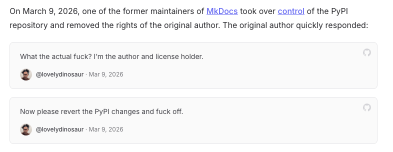 事情的爆点在 2026 年 3 月 9 日,MkDocs 项目作者被一位维护者踢出了项目。此时 MkDocs 已经有 18 个月没有任何维护了。