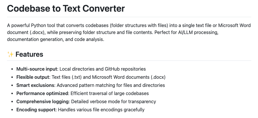 这是一个基于 Python 的工具,其主要功能是将包含多个文件的代码库(文件夹结构)转换并整合为单个文本文件或 Microsoft Word 文档(.docx 格式)。其设计目的是为了方便将整个代码库作为上下文提供给生成式人工智能(GenAI)或大型语言模型(LLM)使用。