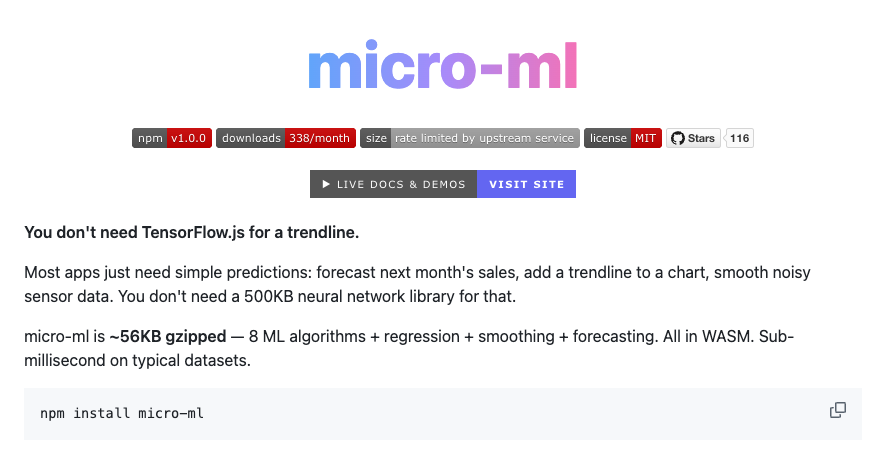 - [4] AdamPerlinski/micro-ml: Tiny ML & statistics library for JS — 16 algorithms in ~56KB gzipped. Rust/WASM, zero dependencies.: https://github.com/AdamPerlinski/micro-ml