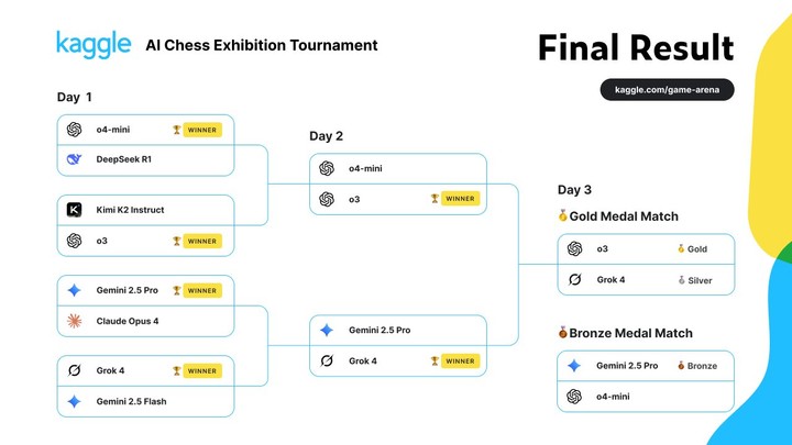 大模型第一人的 OpenAI 最终夺冠还是有点实力的。倒是 DS 和 Kimi K2 首轮出局有些意外,但了其他的报道感觉和规则也有关系。下次也可以让 AI 们来玩玩中国象棋嘛!