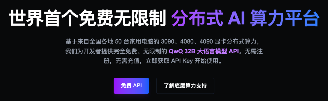 一个免费无限制分布式 AI 算力平台,支持调用 QWQ32B 的 API。算力来自全国各地 50 台家用电脑,也可以贡献自己的闲置算力换取积分。